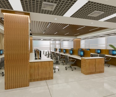 The renders illustrate workstation layouts, lighting strategy, material finishes, and ceiling systems, helping stakeholders visualize the spatial experience and design intent before construction.